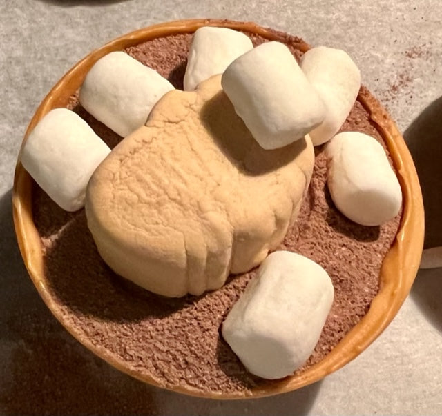 SMORES - Chocolate shell with smores cocoa mix, graham crackers & marshmallows inside, drizzled with white & dressed with graham crackers, mini Hershey chocolate bar & marshmallows on top.