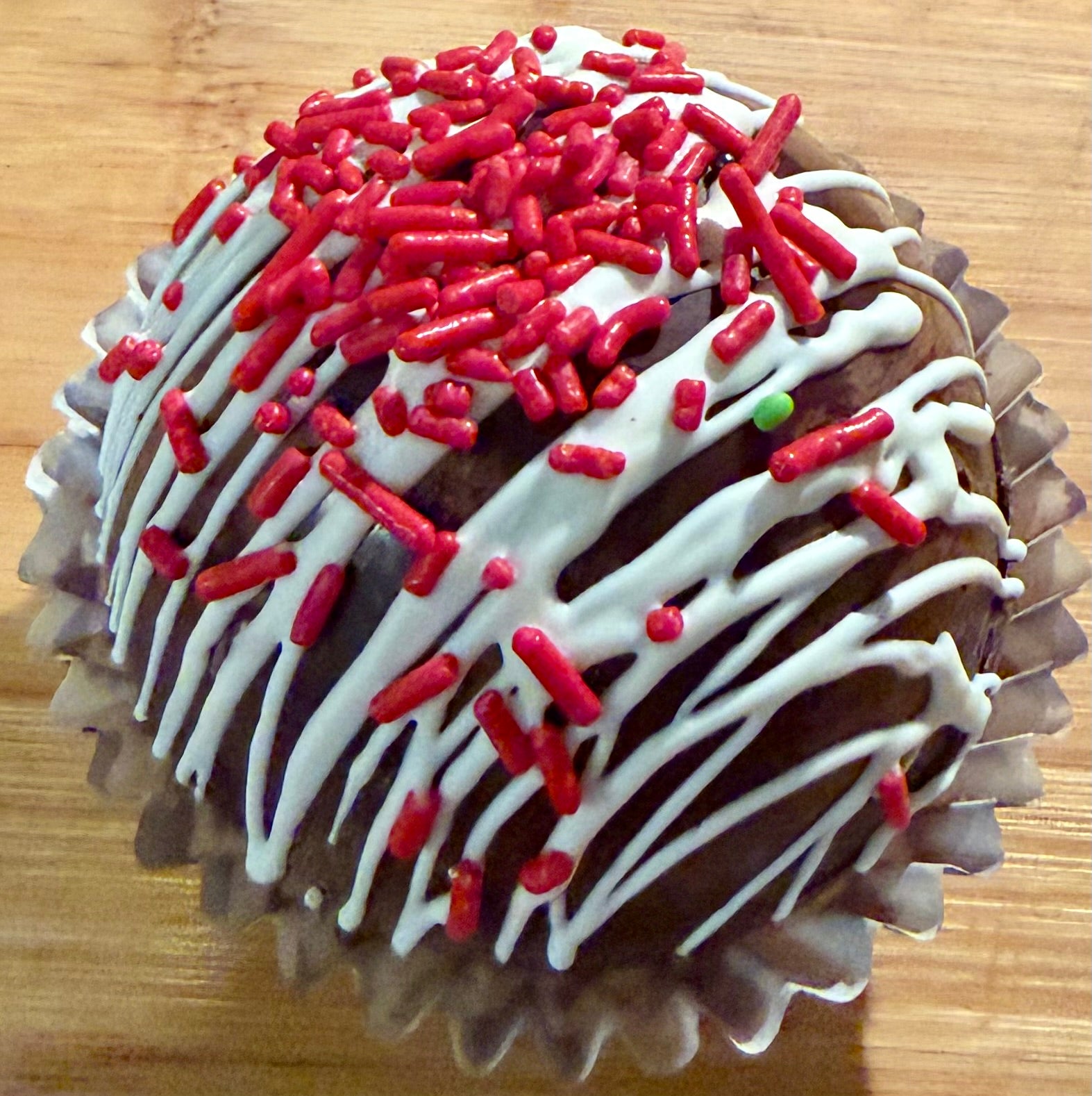 BLACK CHERRY - Dark Chocolate Shell, black cherry cocoa & marshmallows inside, drizzled with white and dressed with cherry flavored sprinkles on top.